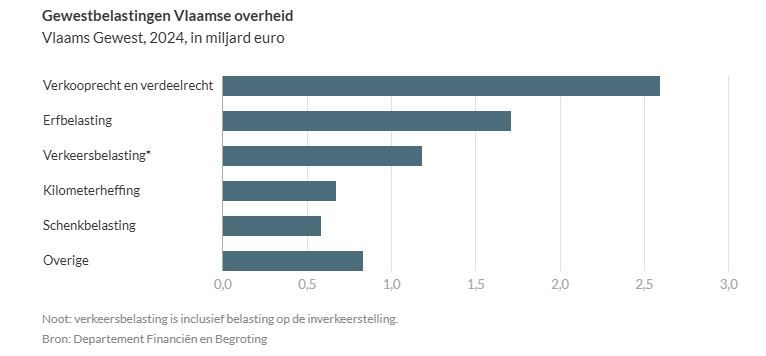 De overige 7,5 miljard zijn de echte gewestbelastingen die Vlaanderen zelf bepaalt en int. Hiervan zijn 1,7 miljard euro erfbelasting. De andere rubrieken in deze categorie gaan over verkoop - en verdeelrechten, verkeersbelasting, kilometerheffing en nog een paar andere heffingen.