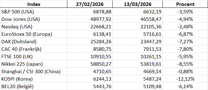 Een tweede vraag gaat dikwijls over de (economische) kostprijs van de oorlog. Vooral het effect op de financiële markten en de 'kostprijs' voor de belegger is verder het onderwerp van deze blog. Als officieel begin van de oorlog nemen we 28 februari 2026. Daarmee zijn er net twee weken oorlog om.